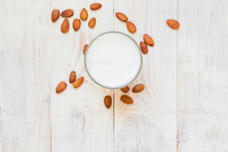 Вид сверху на домашнее миндальное молоко в стакане и разбросанные орехи на деревянном фоне. копировать пространство