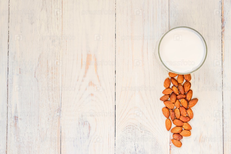 Вид сверху на домашнее миндальное молоко в стакане и разбросанные орехи на деревянном фоне. Тонированный. копировать пространство