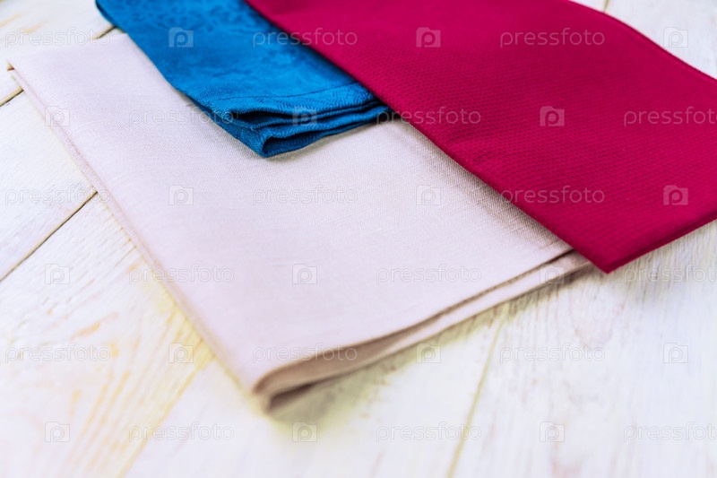 Закройте тканевые салфетки бежевого, синего и бордового цветов на деревенском белом деревянном столе
