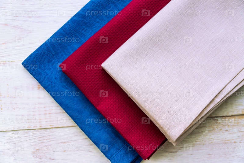 Вид сверху на тканевые салфетки бежевого, синего и бордового цветов на деревенском белом деревянном фоне