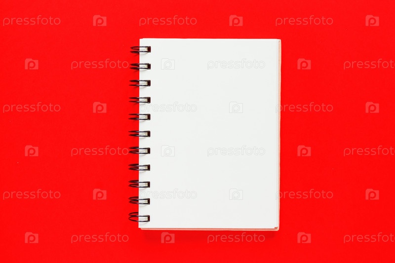 Вид сверху на открытую пустую тетрадь на ярко-красном красочном фоне