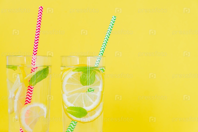Домашний лимонад с лимоном и мятой на цветном желтом фоне. Летний холодный коктейль. Копипространство