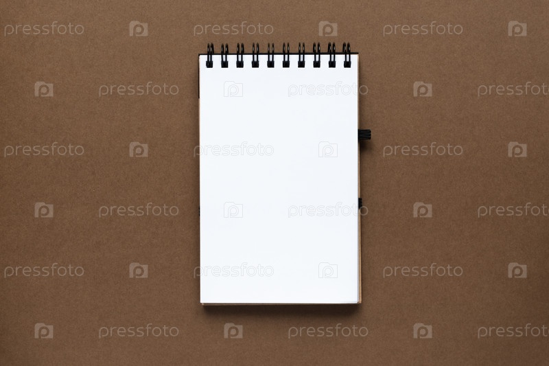 Вид сверху на открытую пустую тетрадь с обложкой из переработанной бумаги на коричневом красочном фоне