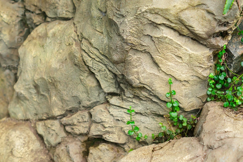 Естественный фон из камней и зеленых растений. Выборочный фокус
