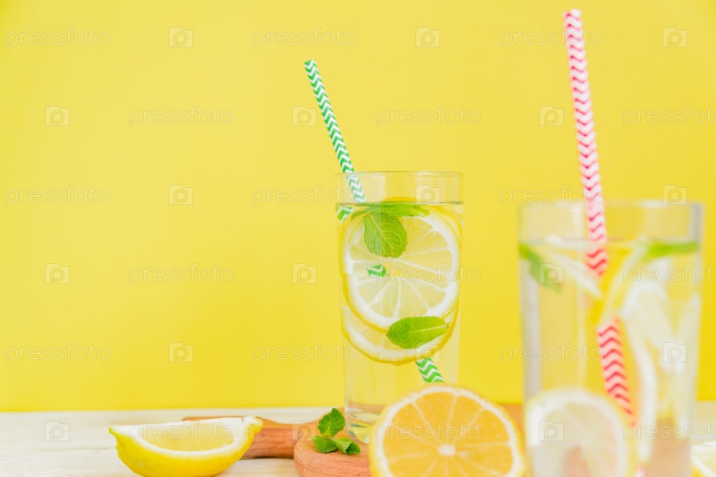Домашний лимонад с лимоном и мятой на цветном желтом фоне. Летний холодный коктейль. Копипространство