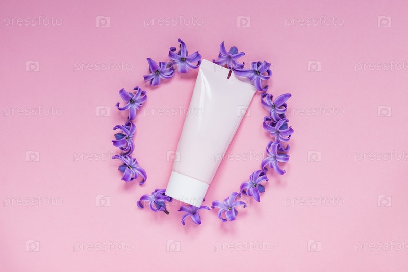 Розовая косметическая трубка в круге цветов гиацинта на пастельно-розовом фоне. Пустой пластиковый контейнер, макет упаковки