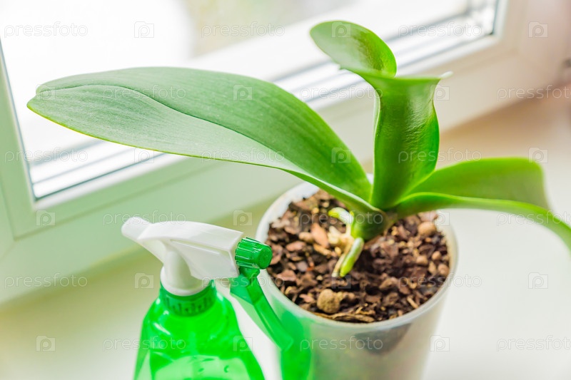 Моховая орхидея в пластиковом горшке и распылитель на подоконнике. Концепция ухода за комнатными растениями