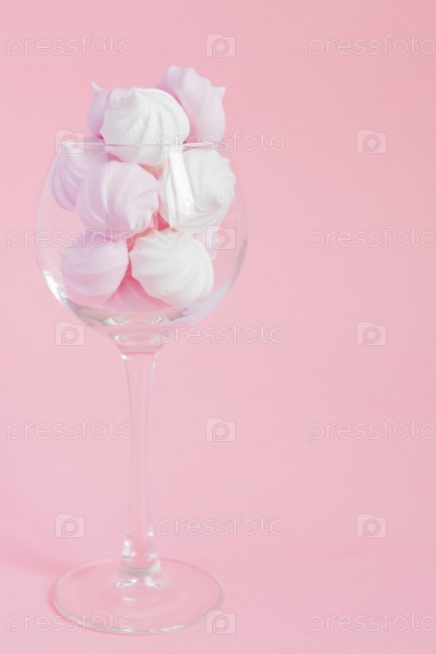 Белые и розовые витые безе в бокале на розовом фоне. Французский десерт, приготовленный из взбитых с сахаром и запеченных яичных белков. Открытка с копией пространства