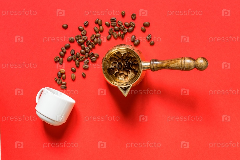 Вид сверху на кофейные зерна в турке (традиционный турецкий кофейник), белая чашка на красном фоне