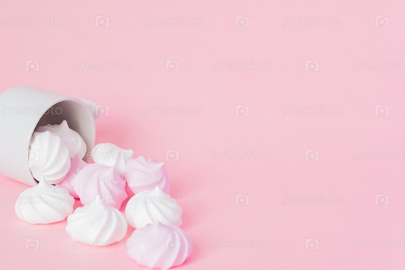 Белые и розовые витые безе в маленькой фарфоровой кофейной чашке на розовом фоне. Французский десерт, приготовленный из взбитых с сахаром и запеченных яичных белков. Открытка с копией пространства