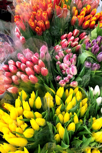 Многоцветные цветущие тюльпаны для продажи в цветочном магазине. Вид сверху