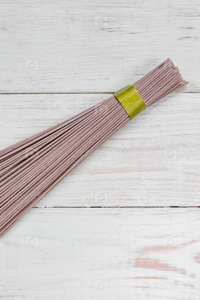 Сырая лапша соба на белом деревянном столе. Традиционная японская еда. Вид сверху, пространство для копирования