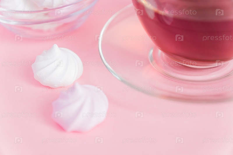 Белые и розовые витые безе и чашка чая на розовом фоне. Французский десерт, приготовленный из взбитых с сахаром и запеченных яичных белков. Открытка с копией пространства