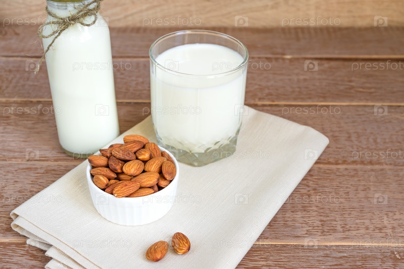 Домашнее миндальное молоко в бутылке и орехи в белой фарфоровой миске на деревянном фоне