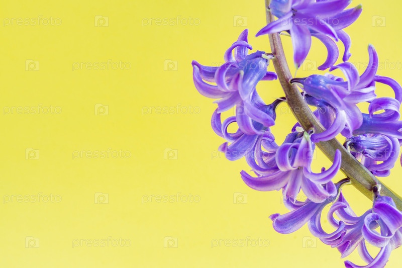 Закройте цветок цветущего голубого гиацинта на желтом фоне