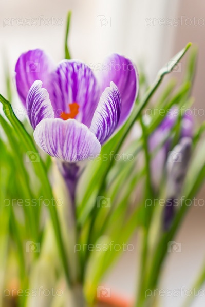 Крупным планом фиолетовые крокусы в цвету на подоконнике. Весенние цветы, домашнее садоводство