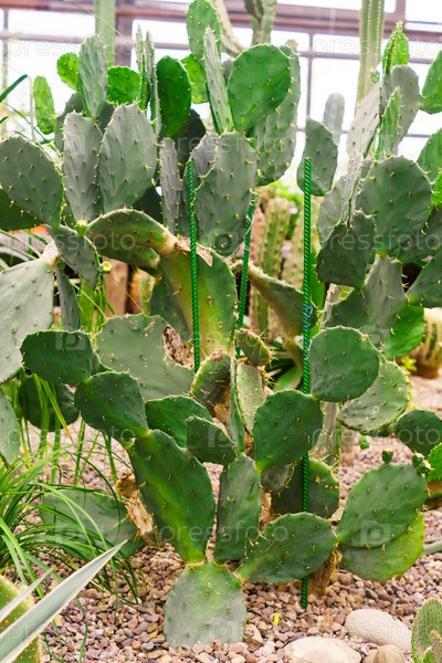Кактус Опунция растет в ботаническом саду. Естественный фон