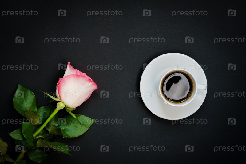 Чашка черного кофе и розовая роза на черном фоне, вид сверху, пространство для копирования