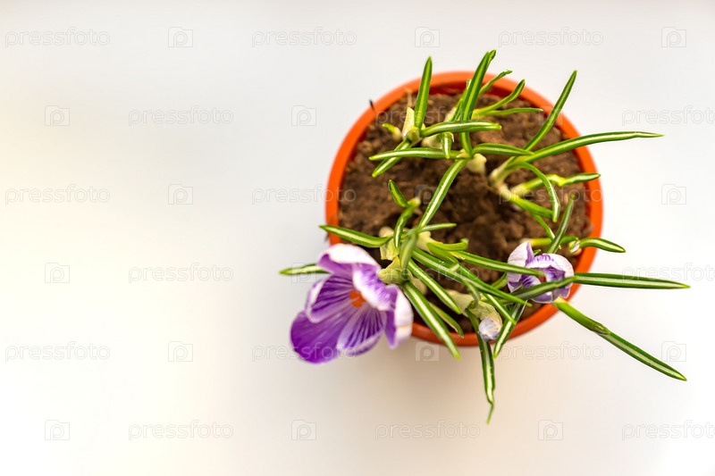 Крупным планом фиолетовые крокусы в цвету на подоконнике. Весенние цветы, домашнее садоводство