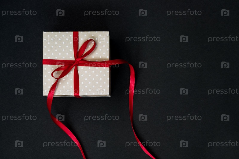 Бежевая подарочная коробка в горошек с бантом из красной ленты на черном фоне с копировальным пространством. Вид сверху