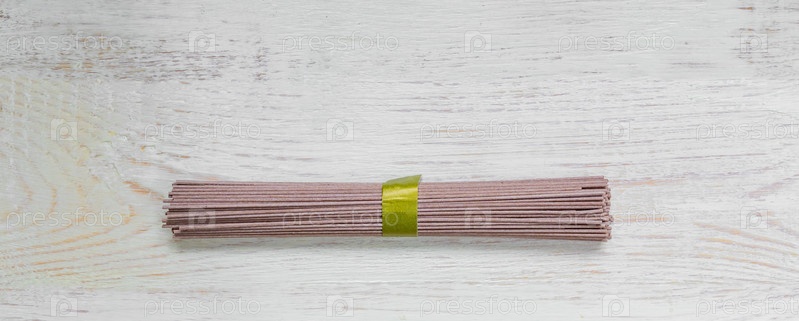 Сырая лапша соба на белом деревянном столе. Традиционная японская еда. Баннер. Вид сверху, пространство для копирования