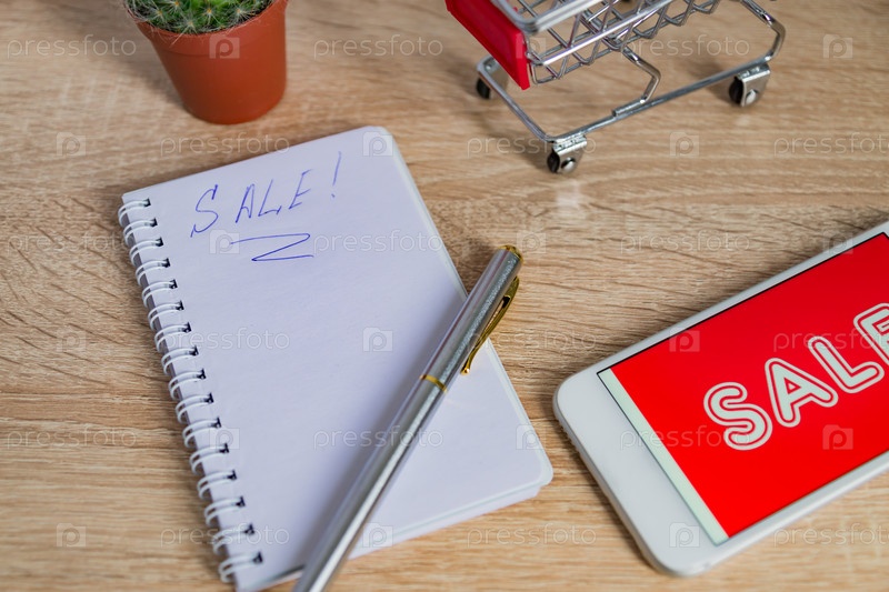 Крупный план офисного стола с белым смартфоном с текстом продажи, заметкой и небольшой корзиной. Концепция интернет-магазинов технологического бизнеса