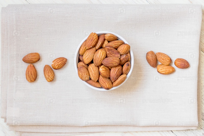 Вид сверху на жареный миндаль в белой фарфоровой миске на текстильной салфетке и белом деревянном столе