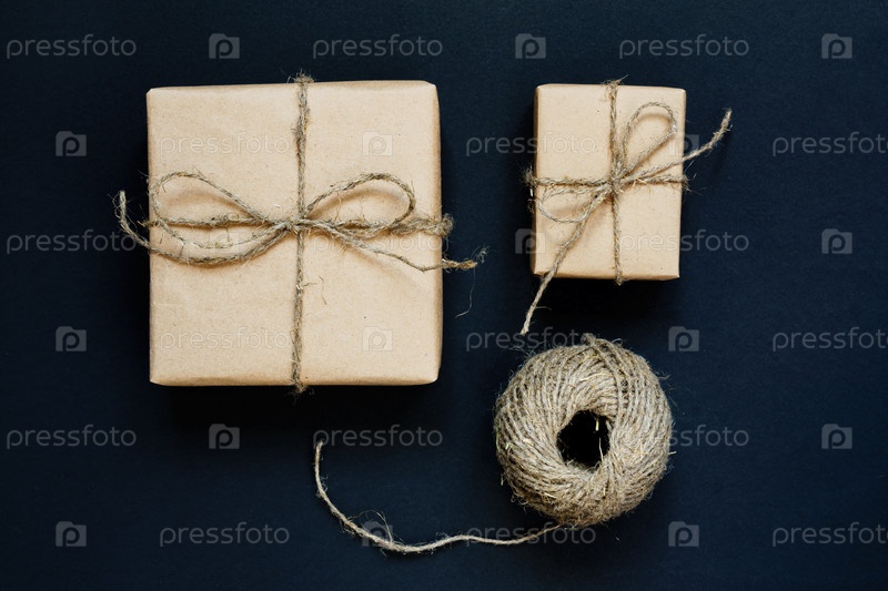Подарочная коробка ручной работы, завернутая в крафт-бумагу с веревкой и бантом на черном фоне. Вид сверху, плоская планировка