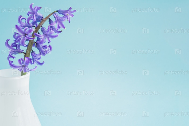Красивый цветущий гиацинт в вазе из белого стекла на синем фоне. Весенний букет для украшения интерьера, креативный фон с копией пространства