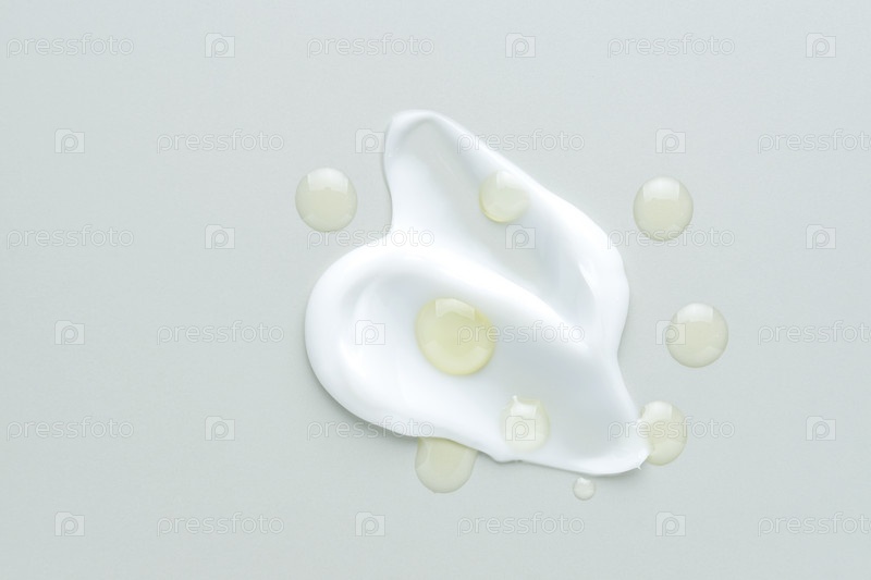 Сыворотка и крем с двойной текстурой, мазок на сером фоне, прозрачная желтая сыворотка, средство по уходу за кожей, плоский слой, крем с гиалуроновой кислотой