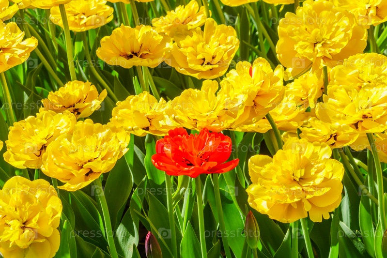 Поле желтых и одного красного тюльпана. Цветочный фон. Пейзаж летнего сада