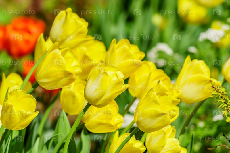 Поле желтых тюльпанов. Цветочный фон. Пейзаж летнего сада
