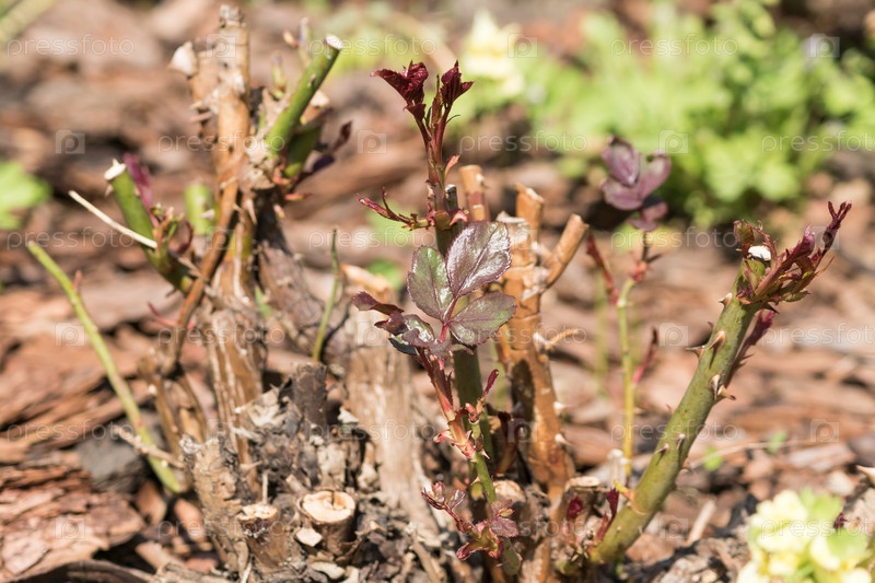 Весной на кустах появляются первые розовые листья. стебли роз в саду