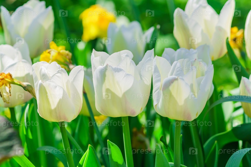 Поле белых тюльпанов. Цветочный фон. Пейзаж летнего сада