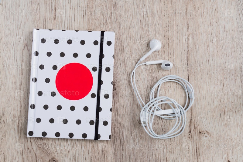 Вид сверху hotebook с обложкой из гороха и белыми наушниками на деревянном столе.Минимальная плоская планировка
