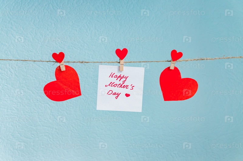 Красные сердечки любви висят на натуральном шнуре на синем фоне. С днем матери надпись на листе бумаги