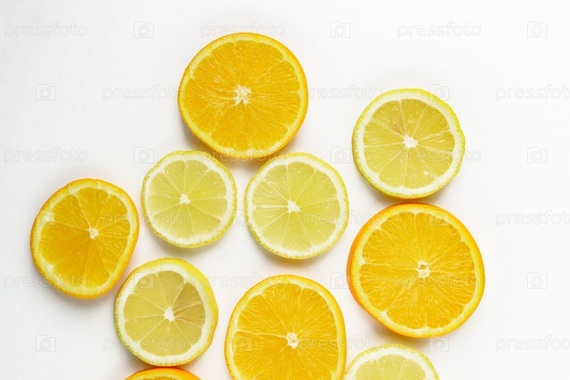 Ломтик цитрусовых, апельсины и лимоны на белом фоне