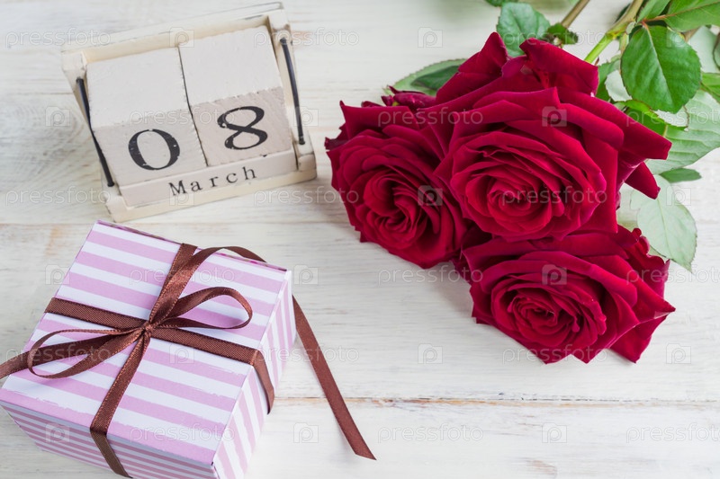 Праздничный подарок, деревянный календарь, букет красных роз и подарочная коробка на деревянном фоне. Концепция поздравления с 8 марта или женским днем