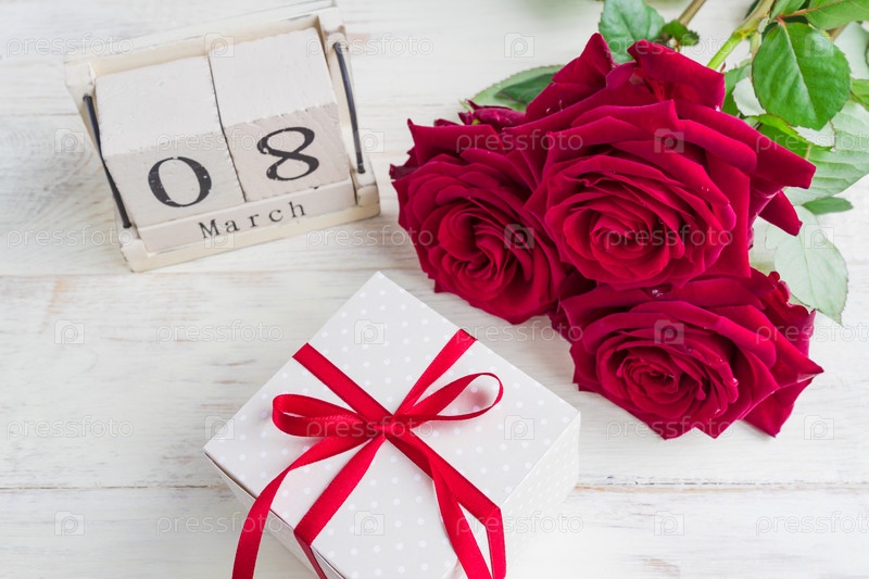 Праздничный подарок, букет красных роз и подарочная коробка на деревянном фоне. Концепция поздравления с 8 марта или женским днем