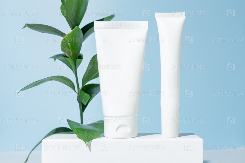 Пластиковые белые тюбики для крема или лосьона для лица и глаз. Уход за кожей или солнцезащитная косметика на белом подиуме на синем фоне с листьями иглицы. Концепция красоты для ухода за лицом