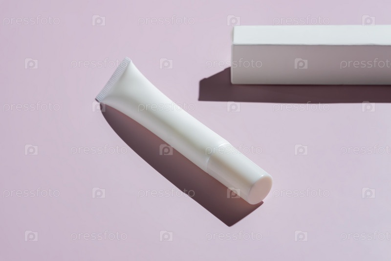 Макет упаковки крема для глаз. Небрендированная пластиковая туба и бумажная коробка на розовом фоне с резкими тенями
