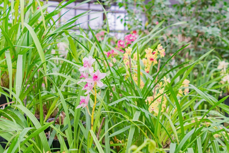 Желтые и розовые экзотические цветы орхидеи в ботаническом саду