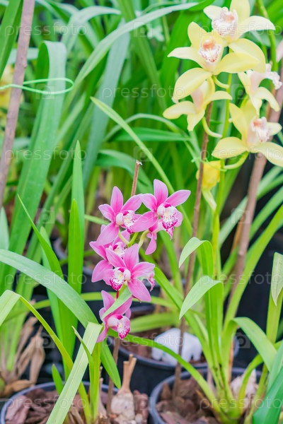 Желтые и розовые экзотические цветы орхидеи в ботаническом саду