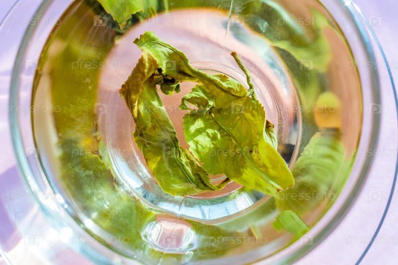 Вид сверху прозрачной чашки с зеленым чаем на фиолетовом фоне