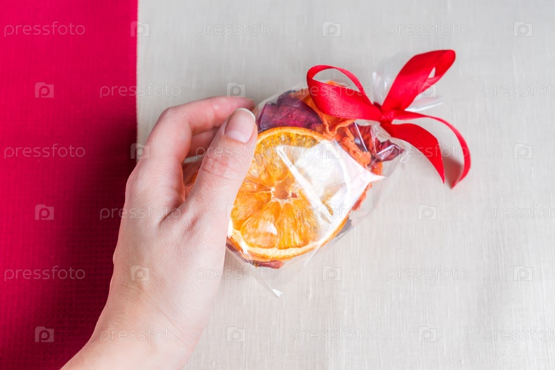 Здоровое питание органическое питание. Нарезанное и сушеное яблоко, апельсин, морковь и свекла в подарочной упаковке в женской руке на текстильном фоне