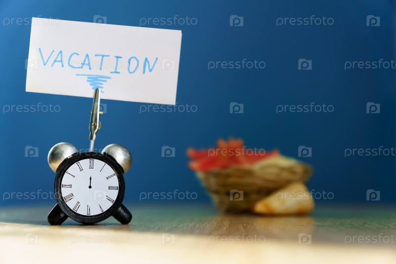 Будильник и баннер с рукописной фразой "отпуск" на деревянном столе. Концепция отпуска