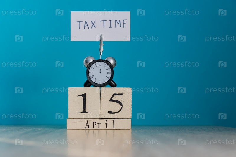 Концепция напоминания о налоговом дне. 15 апреля деревянный календарь и будильник с баннером и рукописной фразой "налоговое время" на деревянном столе