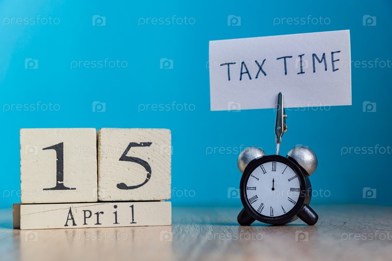 Концепция напоминания о налоговом дне. 15 апреля деревянный календарь и будильник с баннером и рукописной фразой "налоговое время" на деревянном столе