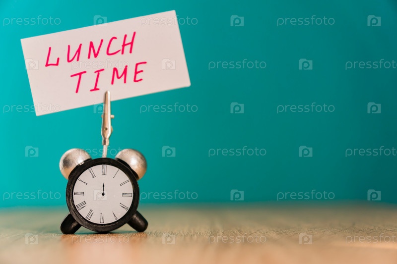 Будильник и баннер с рукописной фразой "время обеда" на деревянном столе. Концепция тайм-менеджмента