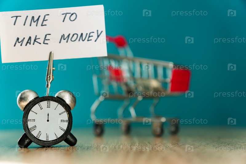 Будильник и баннер с рукописной фразой "время зарабатывать деньги" на деревянном столе. концепция бизнеса
